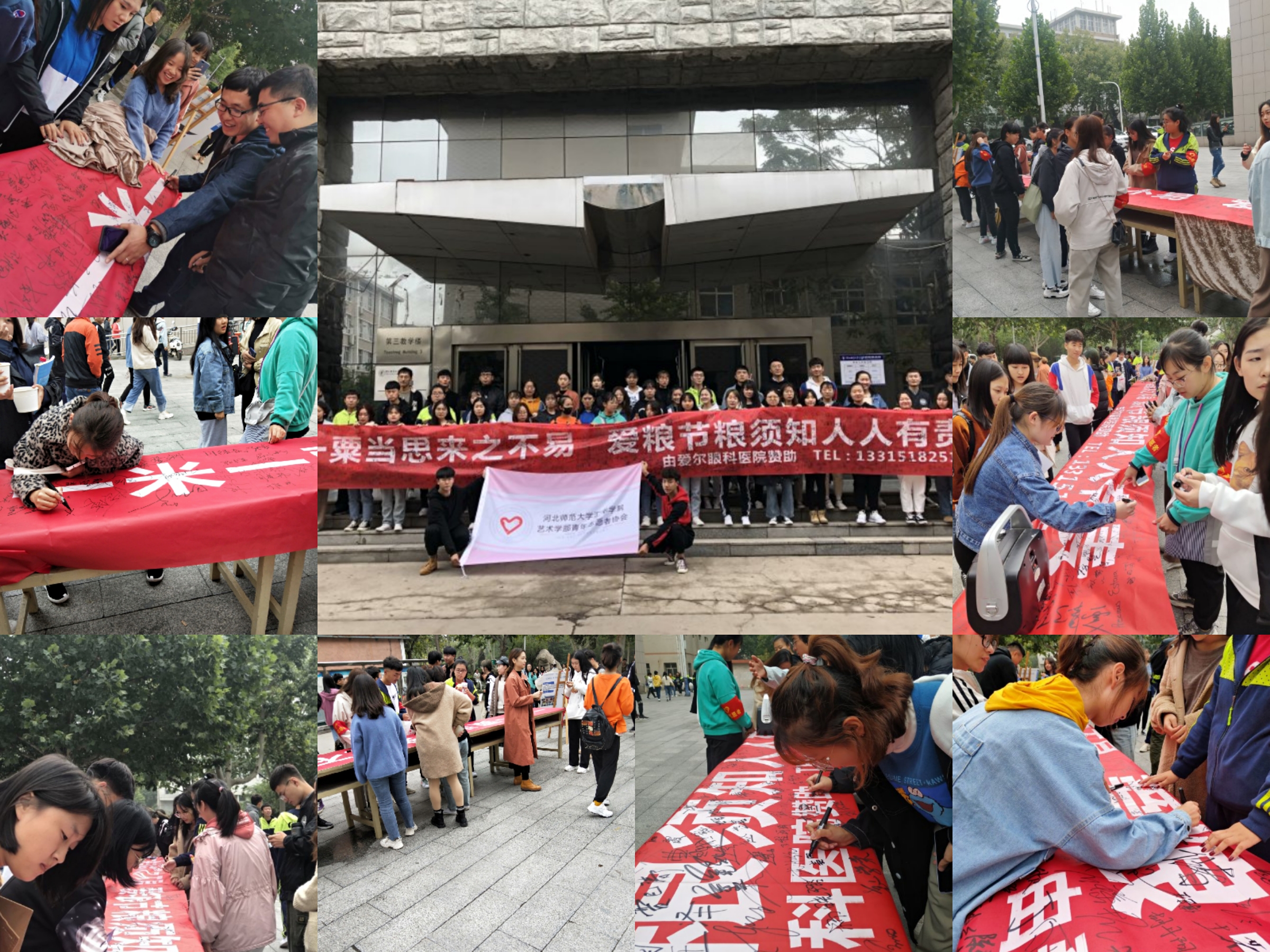 活动在MILE米乐集团食堂东广场顺利举行。中午十一点半,志愿者们摆放展牌,粘贴海报。活动中,志愿者们呼吁师生在横幅上签名,增强了活动的影响力,通过现场讲解更广泛宣传了节粮理念。