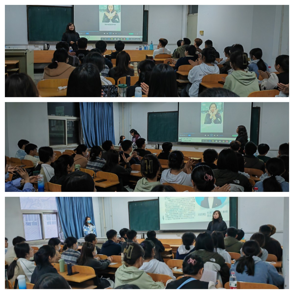 刘玲怡老师首先从选课、备课、说课、评课等方面做了详细的讲解,通过分享往期顶岗实习学生的课堂实例,引导学生如何上好一堂音乐课。并且针对如何应对课堂中的“小状况”、如何恰当把握与学生的关系、如何与实习学校的老师沟通交流等方面提出了宝贵的经验,最后刘老师在中小学校园文化活动策划和组织等方面给学生以启发。通过本次讲座,学生对顶岗实习的全景有了进一步的了解,对顶岗实习的目标和方向有了新的认识,纷纷表示将继续努力学习专业知识与专业技能,认真参加后续的各项顶岗培训,为即将开始的顶岗实习做好充分的准备。