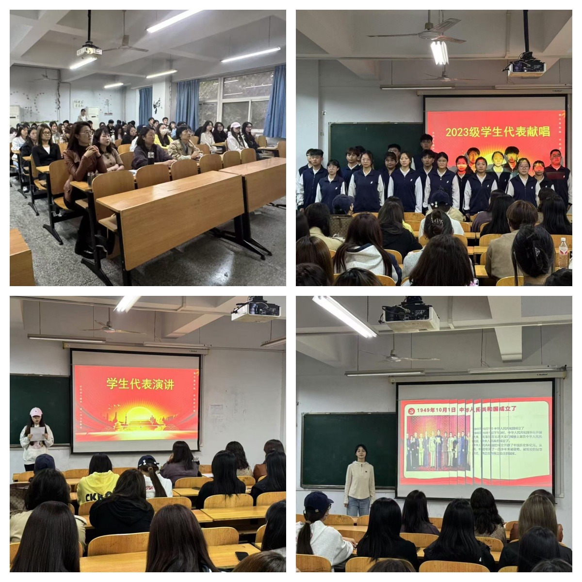 首先由2021级美术学张佳蒨同学通过各种形式讴歌伟大祖国的繁荣昌盛与秀丽山河的美术作品视频展示,讲述中华民族从站起来、富起来到强起来的壮丽画卷,展示以中国式现代化全面推进中华民族伟大复兴进程中的非凡成就。2021级舞蹈学同学胡梦然通过优秀的舞蹈作品《星星之火》视频展示,向大家讲述中国共产党“风雨兼程 砥砺前行”的革命故事。2021级音乐学程子彤同学作为学生代表进行演讲,2024年,是新中国成立的第七十五周年,作为新时代的大学生,要珍惜眼前祖国赋予的繁华盛世,要始终铭记作为这个时代的亲历者、耕耘者、守护者、开拓者,我们应该为中华民族伟大复兴奉献出一份力量。